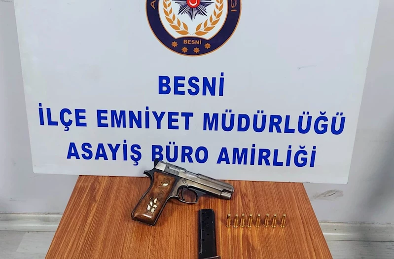 Atatürk Caddesi üzerinde plakası açıklanmayan otomobil Besni İlçe Emniyet Müdürlüğü ekipleri tarafından durduruldu. Polis ekiplerince otomobilde yapılan aramada ruhsatsız tabanca ve mermi ele geçirildi. Ele geçirilenler muhafaza altına alınırken alkollü olduğu tespit edilen sürücü C.T'ye 6 bin 453 TL ceza kesilerek ehliyetine el konulurken, otomobilde bulunan T.A.,ile birlikte gözaltına alındı. Gözaltına alınan şüpheliler işlemlerinin ardından sorgulanmak üzere emniyete götürüldü. Olayla ilgili soruşturma sürdürülüyor.