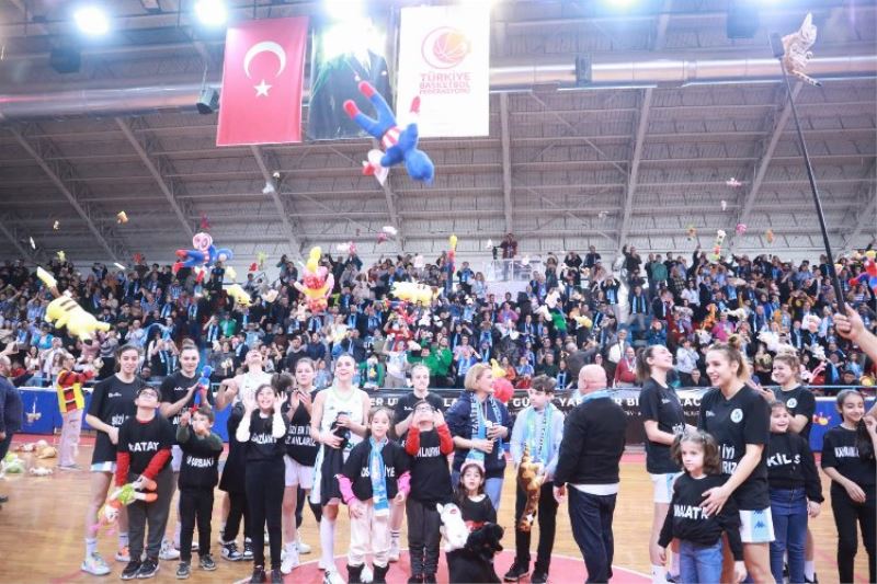 İzmit Belediyespor Kadın Basketbol Takımı’nın Atatürk Spor Salonu’nda Kırklareli Basket’i ağırladığı müsabakanın devre arasında maça gelen vatandaşlar getirdikleri pelüş oyuncakları sahaya attı.