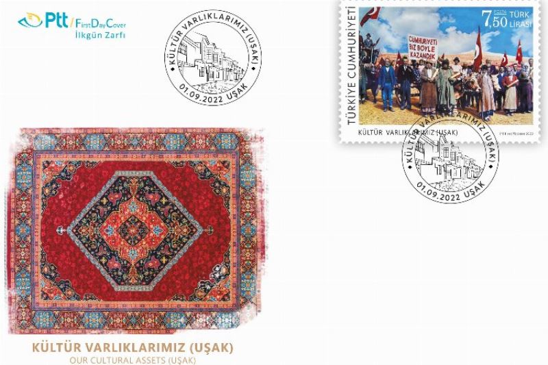 İSTANBUL (İGFA) - PTT AŞ, 01 Eylül 2022 tarihinde "Kültür Varlıklarımız (Uşak)" konulu 7,50 TL (52x72 mm boyutunda) bedelli anma pulunu, söz konusu pula ait 15 TL bedelli ilkgün zarfını PTT iş yerlerinde, PTT’ye ait www.filateli.gov.tr web adresinde ve filateli cep uygulamasında satışa sundu.