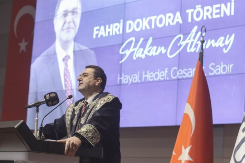 Hakan Altınay’a, girişimciliğinin yanı sıra elektromekanik, robotik, yazılım gibi konularda faaliyet gösteren uluslararası düzeyde şirketler kurarak gerçekleştirdiği Ar-Ge çalışmalarıyla ülkemizin kalkınmasına katkıda bulunan ileri teknoloji ürünleri geliştirmesi nedeniyle” fahri doktor unvanı takdim edildi.