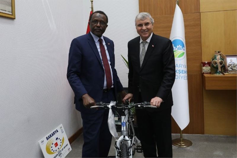 Sudan Öğrenci Topluluğu tarafından düzenlenen mezuniyet töreninde Sudan’lı öğrencilere diplomalarını takdim eden Sakarya Büyükşehir Belediye Başkan Ekrem Yüce, tören sonrası Sudan Ankara Büyükelçisi Nadir YousifEltayeb’i makamında ağırladı. Bakan yüce, kardeşlik anısına Büyükelçiye bisiklet hediye etti.