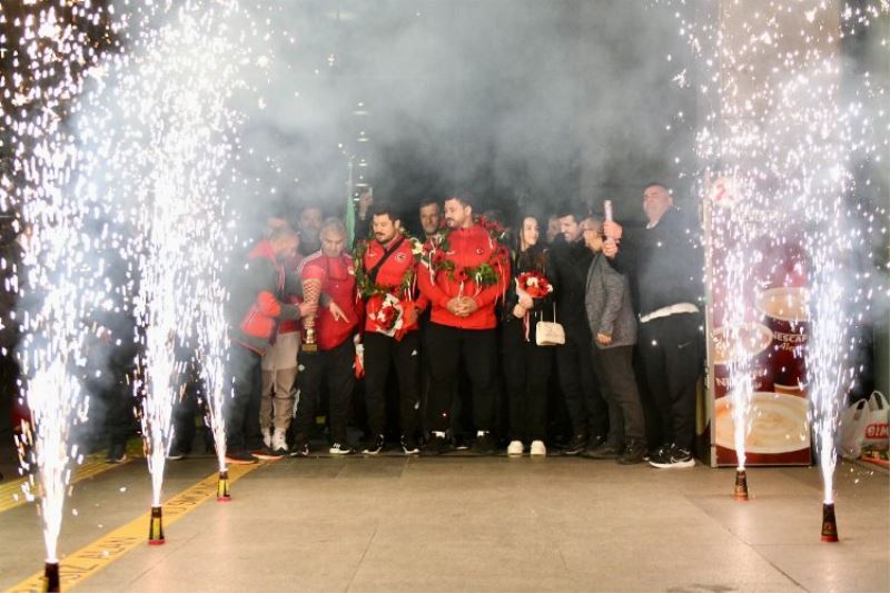 Avrupa Şampiyonası’ndan üstün başarılarla dönen milli güreşçileri Esenboğa Havalimanı’nda kulüp yöneticileri, antrenörleri, çalışma arkadaşları ve vatandaşlar karşıladı.