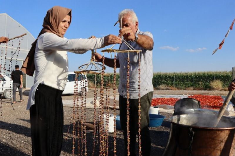 Şanlıurfa Büyükşehir Belediyesi tarafından hayata geçirilen ve kadınlara yönelik istihdamın sağlandığı ‘’Toplum Destekli Seracılık’’ projesi kapsamında seralarda hasat yapıldı. Kadınların kazanlarda kaynattığı şire, iplere sarılan fıstık cevizle buluşarak sucuklu kuruyemiş haline getirildi.