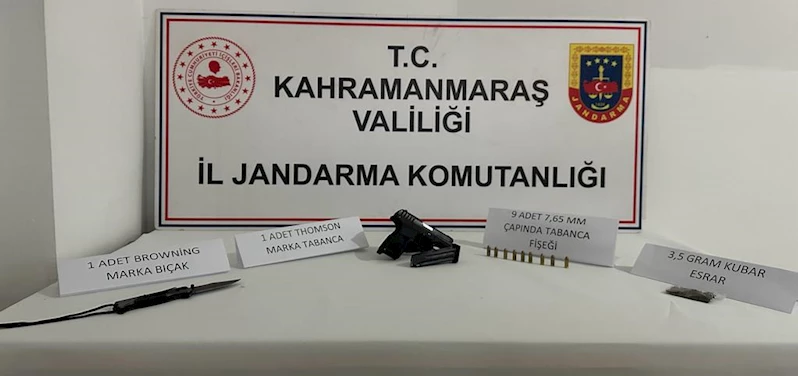İl Jandarma Komutanlığı Pazarcık İlçe Jandarma Komutanlığı ekiplerince, kasten öldürme suçundan aranan M.T.A’yi (27) ticari araçla Adıyaman’dan Mersin yönüne gideceği bilgisi üzerine operasyon düzenlendi. Jandarma ekiplerince yapılan operasyonda ticari araçla kaçmaya çalışan M.T.A’yı gözaltına aldı. Şüphelinin üst aramasında 1 tabanca, şarjör, mermi, bıçak ve uyuşturucu madde bulundu. Jandarmada işlemleri tamamlanan şüpheli, uyuşturucu ve uyarıcı madde bulundurmak, 6136 sayılı kanuna muhalefet, kasten adam öldürme ve nitelikli dolandırıcılık suçlarından yasal işlem başlatıldı.