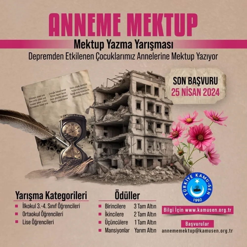 Ailesi depremden etkilenen çocukların duygu ve düşüncelerini annelerine yazacakları mektuplarla anlatacak ve Türkiye Kamu-Sen çocukların duygularına tercüman olacak. Düzenleneck yarışma, İlkokul 3 ve 4. Sınıflar, Orta Okul ve Lise öğrencilerine yönelik olarak üç farklı kategoride gerçekleştirilecek.