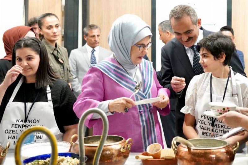 ANKARA (İGFA) - Özel eğitime ihtiyacı olan 18 yaş üstü yetişkin bireyler için açılan "Feneryolu Özel Yürekler Halk Eğitimi Merkezi" açılışında Erdoğan ve Özer, ilk olarak yiyecek içecek atölyesini ziyaret etti. Hafif düzey zihinsel engelli öğrencilerin şeflerinden yaptıkları çalışmalarla ilgili bilgi alan Erdoğan, sohbet ettiği öğrencilerin hazırladığı soğuk ayran aşı çorbasını tattı.