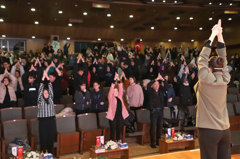 Arş. Gör. Uzun, salondaki öğrencilere sınav stresini azaltarak enerjilerini artırmak ve daha sağlıklı bir sınav süreci geçirmeleri için yapmaları gereken fiziksel hareketlerle ilgili bilgi verdi.