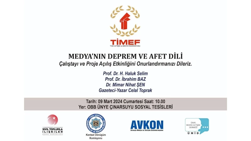 Genel Başkanlığını Şakir Gürel'in yaptığı Tüm İletişim ve Medya Federasyonu (TİMEF) tarafından deprem ve afetlerin yaşandığı dönemlerde halkın bilinçlendirilmesinde en önemli görevi üstlenen medya mensuplarının haber, köşe yazısı ve yorumlarında uygulaması gereken ifade ve sunum yöntemi konularında bilgilendirilmesi amacıyla düzenlenen "Medya'nın Deprem ve Afet Dili Çalıştayı" yarın Ordu’nun Ünye ilçesinde başlıyor.