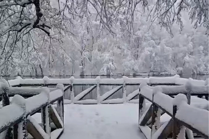Yılın ilk karıyla beyaz gelinliğe bürünen Bolu Yedigöller Milli Parkı, yağan karla birlikte adeta bir masal diyarına dönüştü.