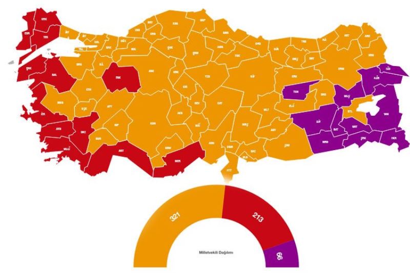 Cumhur İttifakı (Ak Parti 266, MHP 50, Yeniden Refah 5) 321 milletvekili, Millet İttifakı (CHP 169, İYİ Parti 44) 213 milletvekili, Emek ve Özgürlük İttifakı ise (Yeşil Sol 62, TİP 4) 66 milletvekili çıkardı.