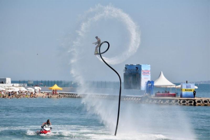 İBB İtfaiyesinin ardından Marmara’nın serin sularında sahneye bir dünya rekortmeni, Kahraman Aktaş çıktı. Backflip branşında rakip tanımayan Aktaş’ın şovu, nefesler tutularak izlendi. Rekortmen sporcu, havada sergilediği salvolar ve estetik manevralarla adeta yer çekimine meydan okudu. Şampiyon, gösterileri izlemeye gelen İBB Başkanı Ekrem İmamoğlu’nu, kendisine Türk Bayrağı vererek karşıladı.